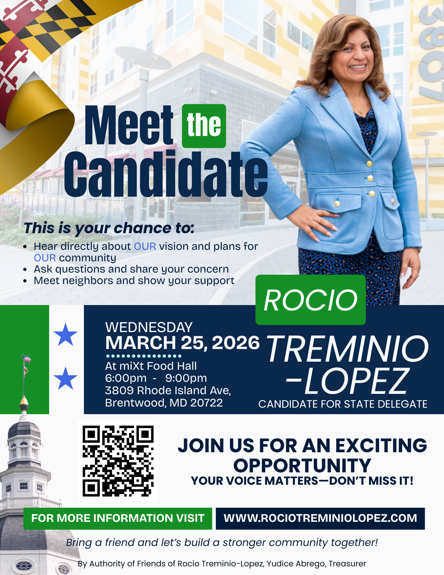 Rocio Treminio-Lopez Democrat for District 47A State Delegate miXt Food Hall 6:00pm – 9:00pm 3809 Rhode Island Ave, Brentwood, MD 20722